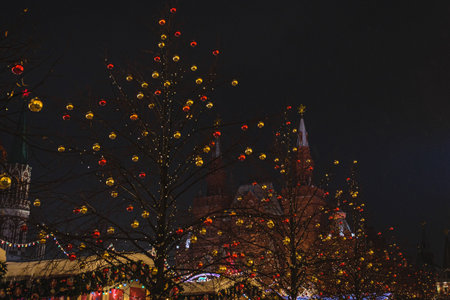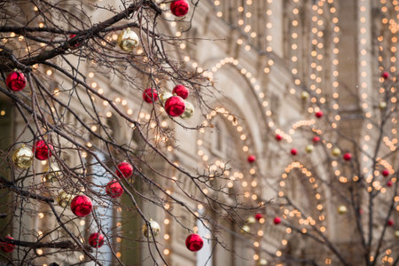 Christmas decorations in the center of New Year's Moscow. Christmas toys hang from fir branches, and garlands sparkle on the building's fa