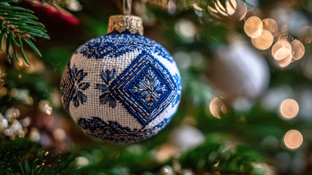 A beautiful blue ornament with intricate gold designs is hanging from a green pine tree branch. This scene captures the festive spirit of the holiday season showcasing seasonal decorations.