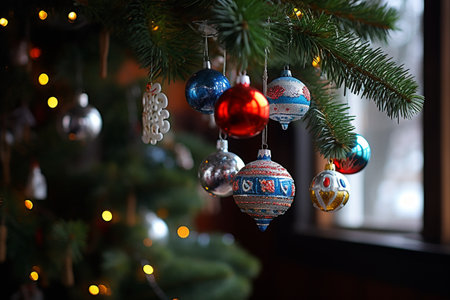 Christmas tree decoration with baubles and ornaments on blurred background