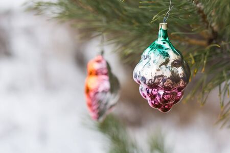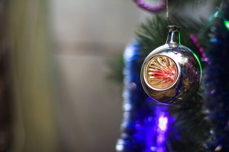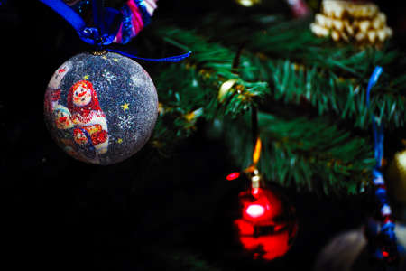 Christmas decorations close-up against the background of a Christmas tree