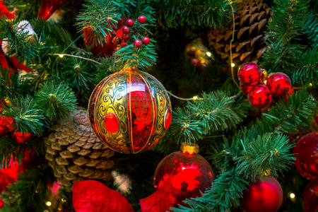 Sparkling red and gold ornaments adorn a Christmas tree, reflecting golden lights and creating a warm, festive December atmosphere for celebrating the holiday season..
