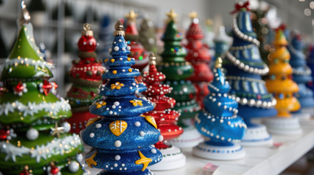 A captivating array of decorative Christmas trees in various colors and designs fills the festive retail space, perfect for holiday celebrations.