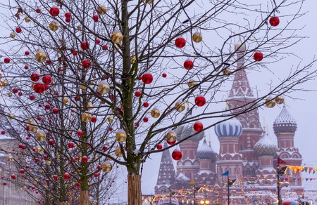 Christmas tree toys on the trees of Red Square in Moscow