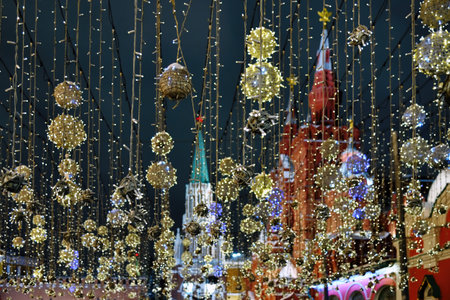 Russia, Moscow, GUM - decorations in the center. New Years Eve State Central Store