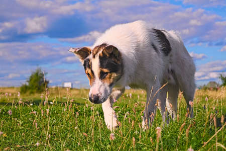 Dog At Summer Sunny Day. Dog At Meadow Or Field. Summer Season. Bright Shine Sky. Dog On Summer Grass