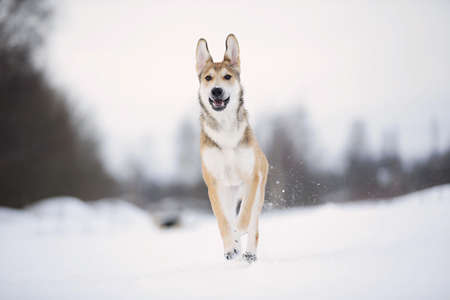 Close up portrait of a cute mixed breed dog in snowy winter. Dog running and having fun in the snow