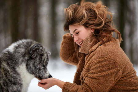 Love to the animals. Young woman playing in the snow with a husky dog.