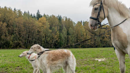 Beautiful russian borzoi or greyhound dogs with horse. Close-up view of dogs and hotse heads. Animal concept. Historical reconstruction of the traditional hunting with russian borzoi dogs.