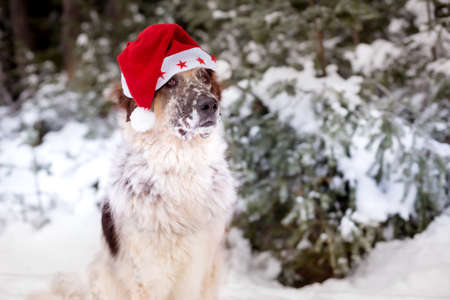 Big cute funny dog in red santa hat sitting near fir tree in winter snow park