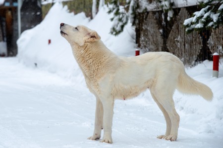 Big dog of the Alabai, a Central Asian shepherd breed in winter on the street. Close-up shooting. Shepherd, a guard dog of huge size