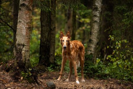 White Russian Wolfhound Dog, Borzoi, Hunting dog, Sighthound in Spring Summer Forest. These dogs specialize in pursuing prey, keeping it in sight, and overpowering it by their great speed and agility