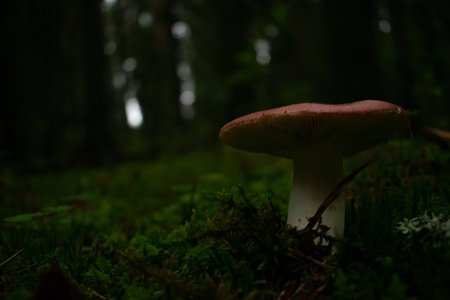 Colorful and gloomy photo of a mushroom in the forest. high quality photo