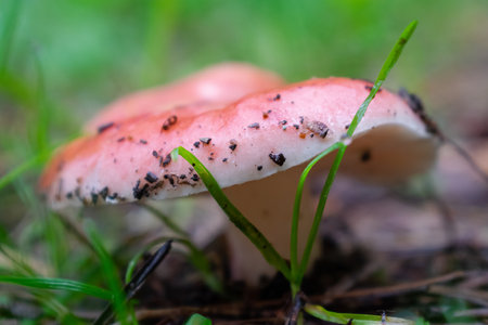 Russula mushroom in forest. Beautiful little edible fungus. Seasonal collect of edible mushrooms