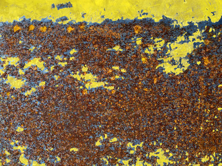 Rust, steel, background. Peeling off old paint Blue yellow white