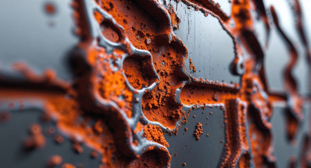 A detailed close up of a heavily oxidized and rusted metal surface, showcasing peeling paint, vibrant orange tones, and intricate corrosion patterns. this abstract texture is ideal for backgrounds or industrial themes.