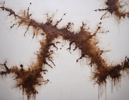 Abstract grunge background with brown ink splashes on white paper.