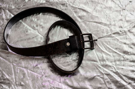 Black belt on a wooden table. Black and white photos. Selective focus.