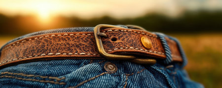 Close-up of a brown leather belt fastening on blue denim jeans in soft lighting
