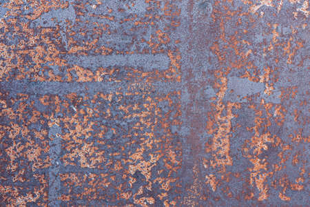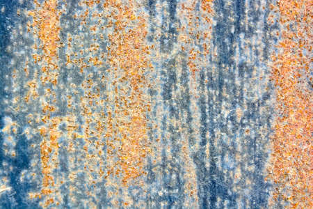 Macro of rusting metal with a peeling paint texture. Rusty metal, old sheet of iron covered with rust with a blue paint.