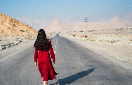Woman walking on the empty dessert road wearing red dress