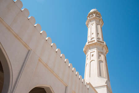 Muscat, Oman - 04.04.2018: Vertical shot of a blue mosque in the bay of old town of Muscat, Oman on a hot day. Blue mosque and minaret, white buildings and sandstone rock in the hazy background.