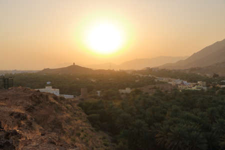 City against mountain range at idyllic sunset. Nizwa in Sultanate of Oman.