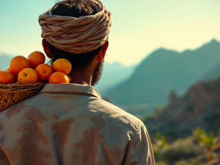 Man Carrying Basket of Granadilla Fruits in Sunset Orchard