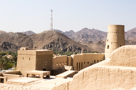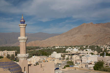 Nizwa town and old fort in Sultanate of Oman. Middle East, desert landscape, mountain and blue sky. Summer, sunny day, no body.