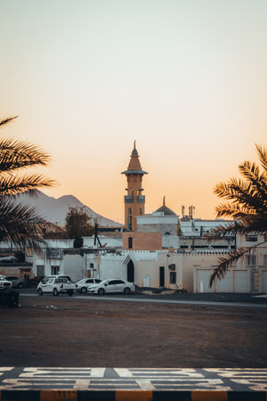 View on the mosque and watch tower in coast town Sur, Oman during sunset