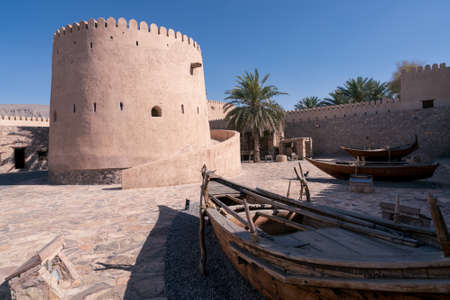 Khasab, Oman - 04.01.2018: Courtyard of medieval arabian fort in Khasab, Oman. Wooden ships exhibition.