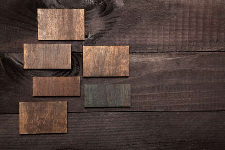 Small colored pieces of wood on a dark wooden table, with space for your text