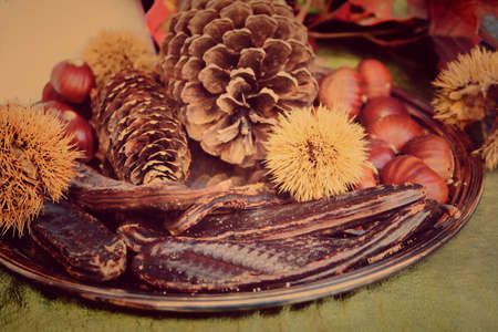 Products of autumn in Italy, chestnuts, pine cones and carob