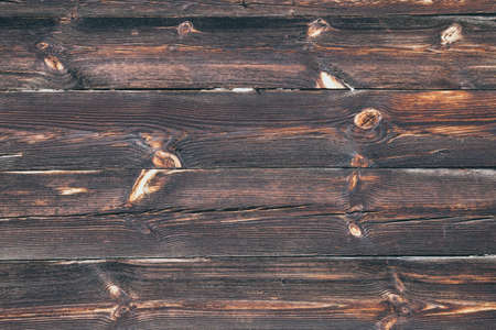 Vintage brown wood background texture with knots. Old painted wood wall. Brown abstract background. Vintage wooden dark horizontal boards. Yop view with copy space. Background for desk