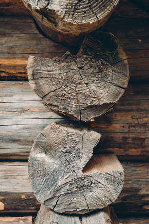 Close up of log cut surfaces of old traditional wooden log house