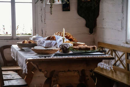 Kourim, Czech Republic, 26 December 2021: Interior of Traditional village house, benches and table, tree upside down, country-style architecture, Christmas in Skanzen, open-air ethnographic museum