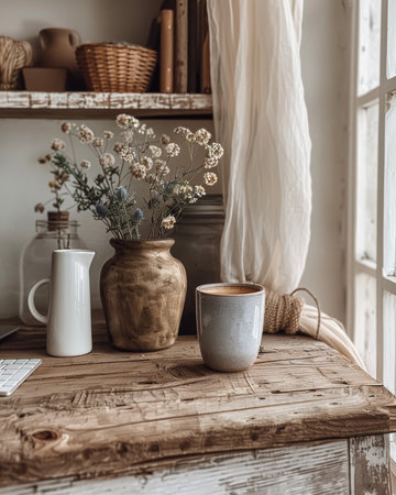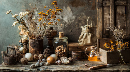 A charming rustic still life arrangement featuring dried flowers, wooden objects, glass jars, and vintage containers, creating a warm, nostalgic atmosphere.