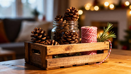 Rustic wooden crate holding a glass jar filled with pinecones, red and white twine, and evergreen sprigs on a wooden table. Warm bokeh lights and festive decor in the background.