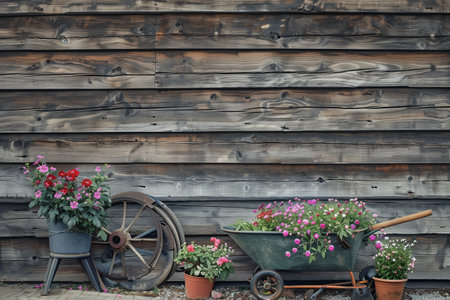 Charming Garden Decor Featuring Flowering Plants and Vintage Wheelbarrow Against Rustic Wooden Wall