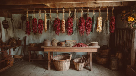 Experience the charm of a rustic farmhouse kitchen with dried produce hanging gracefully. This timeless scene captures the essence of agricultural heritage and warm, earthy tones.