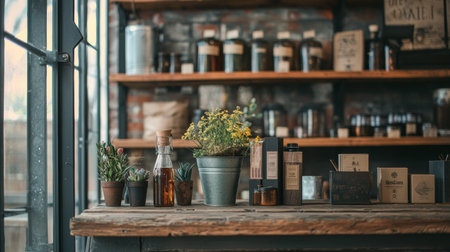 A rustic apothecary shelf filled with jars of herbs and organic products, styled with warm lighting.