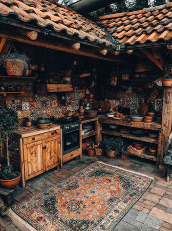 An outdoor kitchen features wooden cabinets and shelving with various pots and decor. The scene is illuminated by natural light, showing a rustic design. The composition includes a patterned rug, tiled backsplash, and terracotta roof. This image is suited for home decor or lifestyle publications.