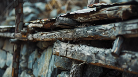 Close up of a pile of old wooden logs in the countryside.
