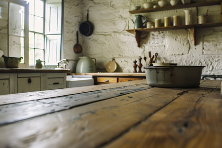 A rustic kitchen scene showcases a worn wooden table with a metal bowl, set against a textured white wall. Natural light illuminates the traditional kitchenware, creating a cozy atmosphere.