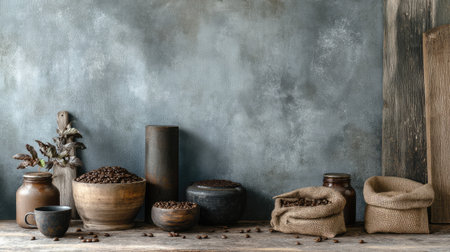 A beautiful rustic arrangement featuring coffee beans in various containers on a wooden table. Enjoy the organic textures and earthy colors suitable for culinary and lifestyle themes.