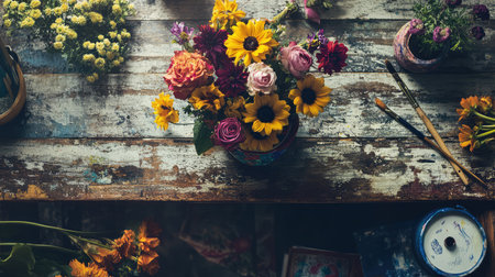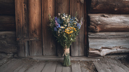 A vibrant bouquet of wildflowers is elegantly arranged against a rustic wooden background, showcasing the natural beauty and charm of outdoor floral decorations.