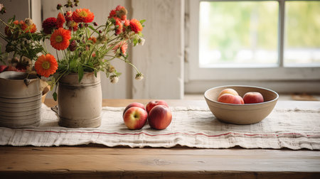 Rustic kitchen with wooden table and wildflower bouquet by sunlit window. That the image is generated using AI.