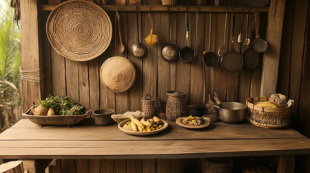 A rustic kitchen scene featuring a wooden table adorned with fresh fruits, vegetables, and cooking utensils, evoking warmth and simplicity in food preparation.