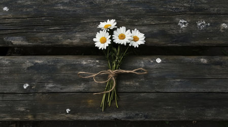 A beautiful arrangement of fresh daisies tied with twine rests on a weathered wooden surface, capturing the essence of nature and rustic charm in a serene setting.