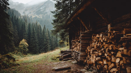 A serene cabin stands in a lush forest, adorned with neatly stacked firewood. The misty mountains create a peaceful backdrop, embodying the essence of nature's tranquility.