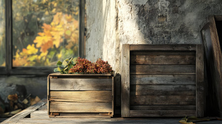 A rustic wooden chest adorned with dried plants and books, set in a cozy, vintage ambiance.